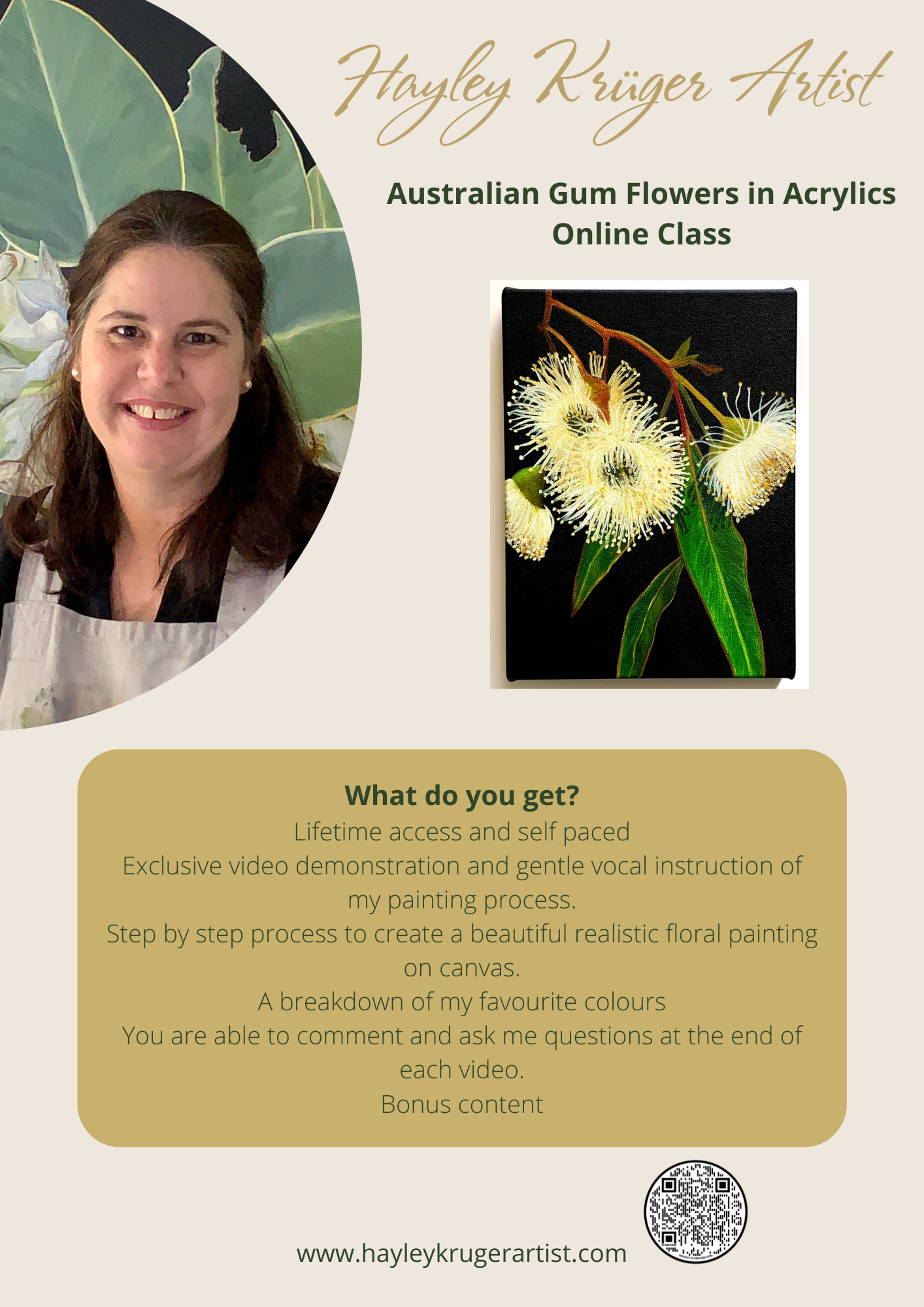 Artist Profile - About your Tutor: Hayley Krüger is an award-winning acrylic artist based in Perth, known for her striking botanical paintings and luminous still life studies. Her work celebrates the joy in everyday moments through vivid depictions of Australian flora and still life, capturing the textures, colours, and light of the natural world.